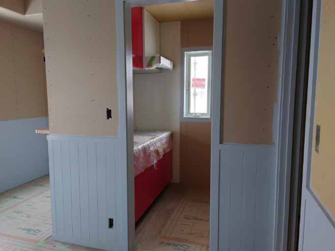 クロスはまだですが、腰壁もブルーグレーに塗られています。こちらは単身用のお部屋。